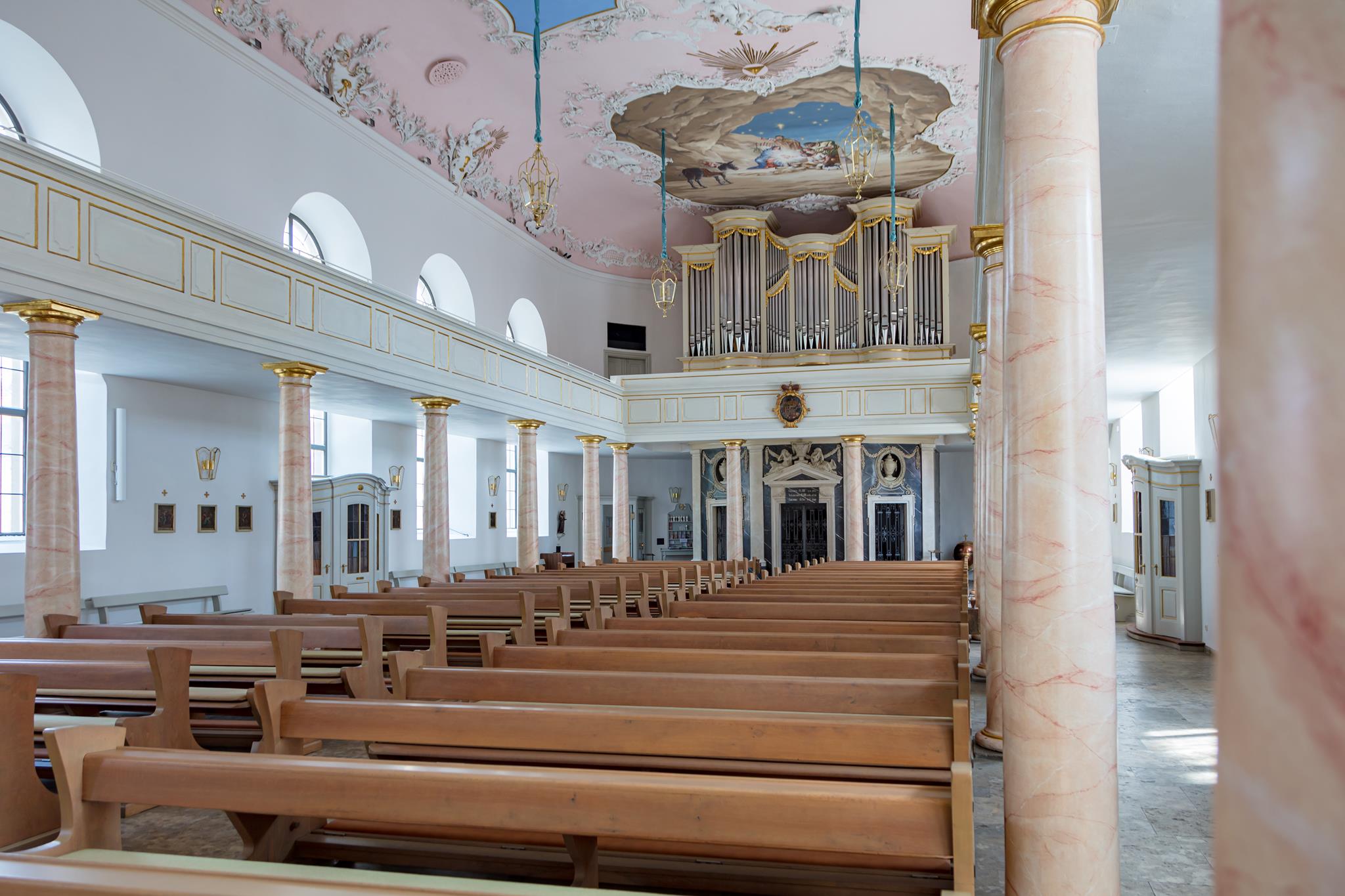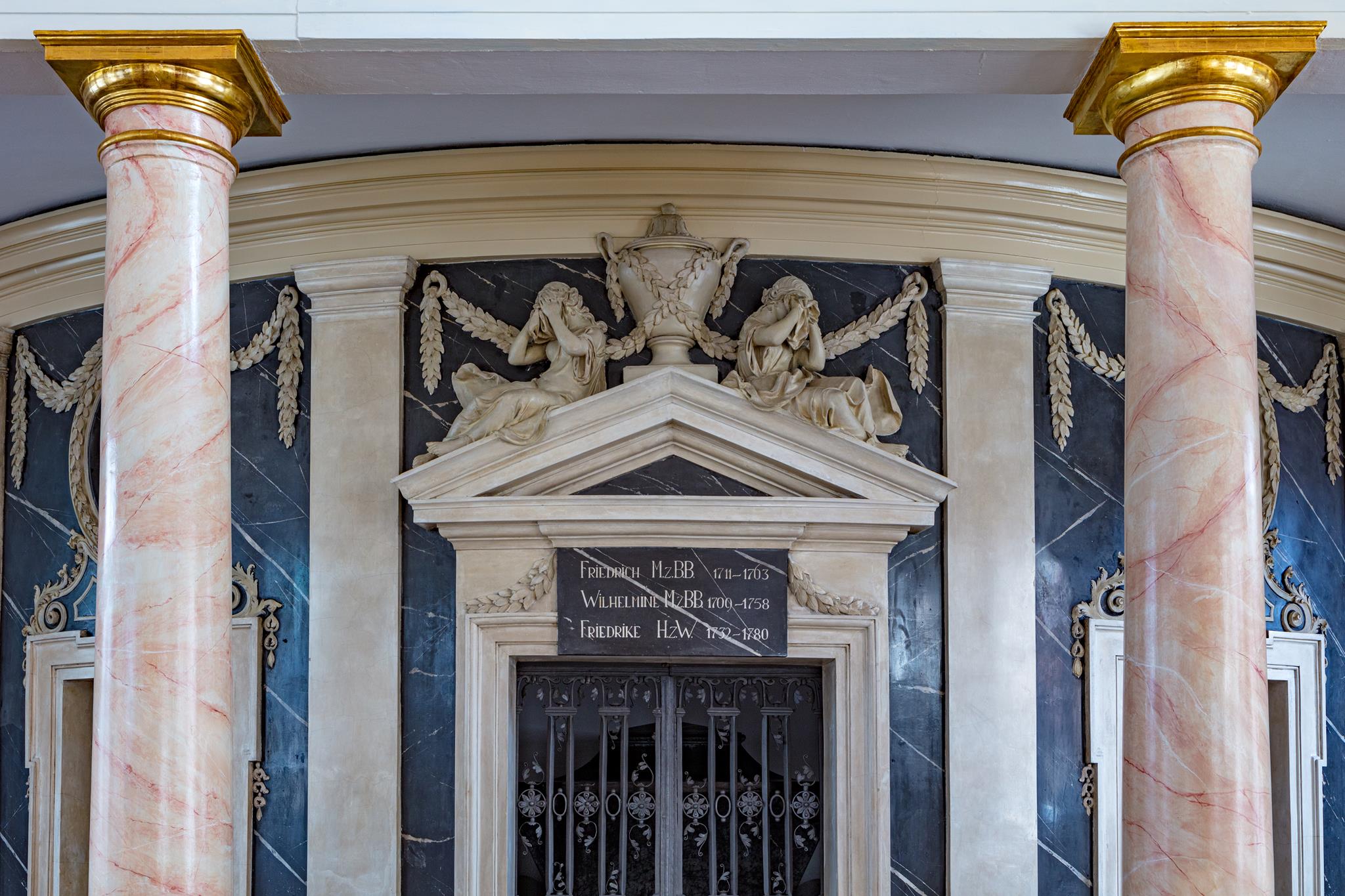 Sie wurde entsprechend umgestaltet: der Kanzelaltar wurde entfernt, die Orgel von der Altarseite an die Stelle der Markgrafenloge versetzt. Erhalten blieb der kunstvolle Deckenstuck von J. B. Pedrozzi, in dem die Erlösung des Menschen durch das Leiden und Sterben Christi symbolhaft dargestellt wird (Leidenswerkzeuge Christi). Zu sehen sind die Grabmale des markgräflichen Ehepaars und ihrer Tochter Friederike Sophie in ihrer oberirdischen Gruft. Die zerstörten Deckengemälde des Hofmalers E. W. Wunder wurden bei der Renovierung im Jahr 2019 durch neue, dem barocken Stil angepasste Gemälde ersetzt. Sie zeigen wie die Originale die Geburt Christi und die Himmelfahrt sowie die vier Evangelisten. Anstelle der Initiale „F“ des Markgrafen Friedrich erstrahlt jetzt über dem Altarraum das goldene Dreieck im Strahlenkranz, das Symbol der Herrlichkeit des dreieinigen Gottes.