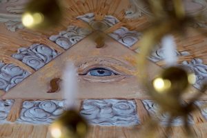 Bild: Auge Gottes im Dreieck mit Strahlenkranz an der Chorwand der Pfarrkirche St. Bartholomäus Mistelgau