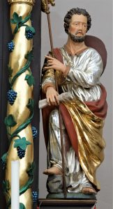 Bild: Jakobus, Altar der St. Jakobuskirche Berg (einer der wenigen evangelischen Barockkirchen mit einer Darstellung des Namenspatrons; hier als Apostel, der auf Jesus Christus hinzeigt)