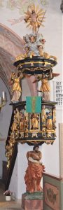 Bild: Kanzel in der St. Bartholomäuskirche Mistelgau mit den typischen Elementen: Kanzelfuß (Simson), Kanzelaufgang (Apostel), Kanzelkorb (Christus und Evangelisten), Kanzeldeckel (getragen von Engeln, Unterseite: Heilig-Geist-Taube, Bekrönung: Auferstandener)