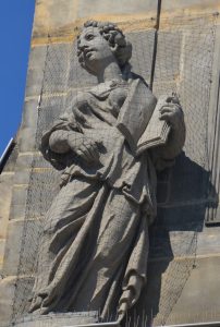 Bild: Eine der vier Kardinaltugenden (Weisheit/Klugheit) an der zum Markt gerichteten Fassade der Spitalkirche Bayreuth als weithin sichtbare Aufforderung, Gutes zu tun.