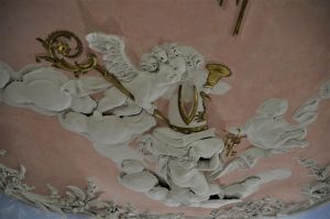 Bild: Bischofsstab und -mütze (Mithra) an der Decke der Schlosskirche lassen vermuten, dass der katholische Künstler seinem evangelischen Auftraggeber einen Streich spielen wollte. Doch die Gegenstände beziehen sich auf Jesus Christus, dem „Bischof unserer Seelen“.
