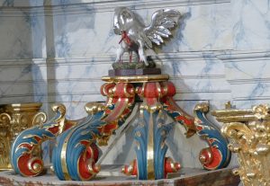 Bild: Pelikan auf dem Kanzeldeckel der Stiftskirche Bayreuth (nachträglich aufgesetzt anstelle des Stifterwappens)