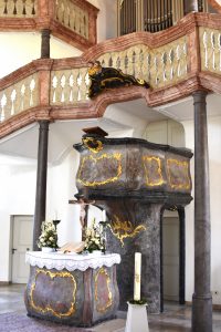 Bild: Kanzelaltar mit Altartisch aus Stuckmarmor in der Friedenskirche Berndorf